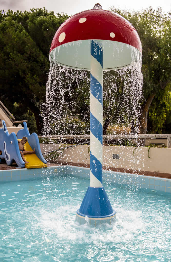 The smaller pool is shallow, with water games and a relaxation area with jacuzzi, air massage and water blade, for a real moment of break and fun in complete safety.